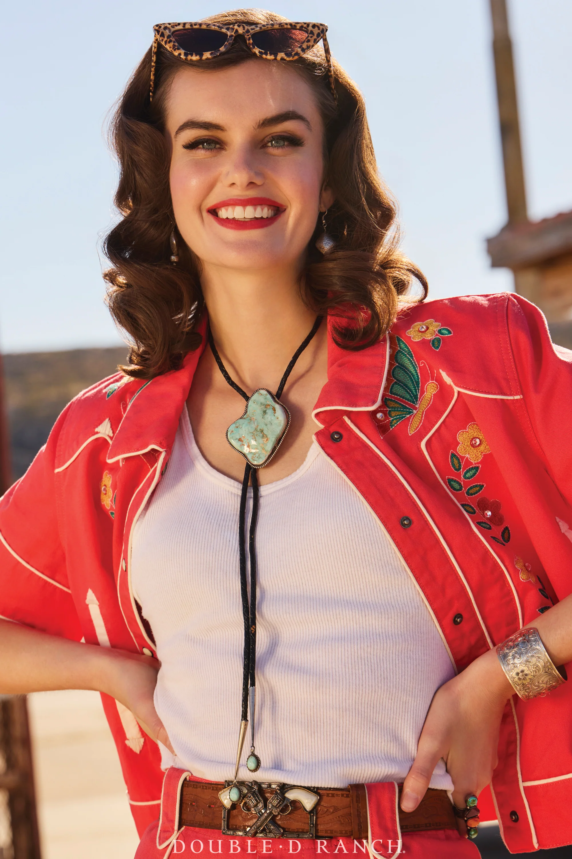 Come for the color and stay for the silhouette! The vibrant hue falls somewhere between coral and pink, bringing to life a chic cropped half-sleeve jacket that’s punctuated by contrast piping and embellished with floral and butterfly embroidery – and a bit of bling for good measure. Fasten the pearl snap placket to wear it as a top or rock it open as a jacket over a solid tank – it’s gorgeous either way!