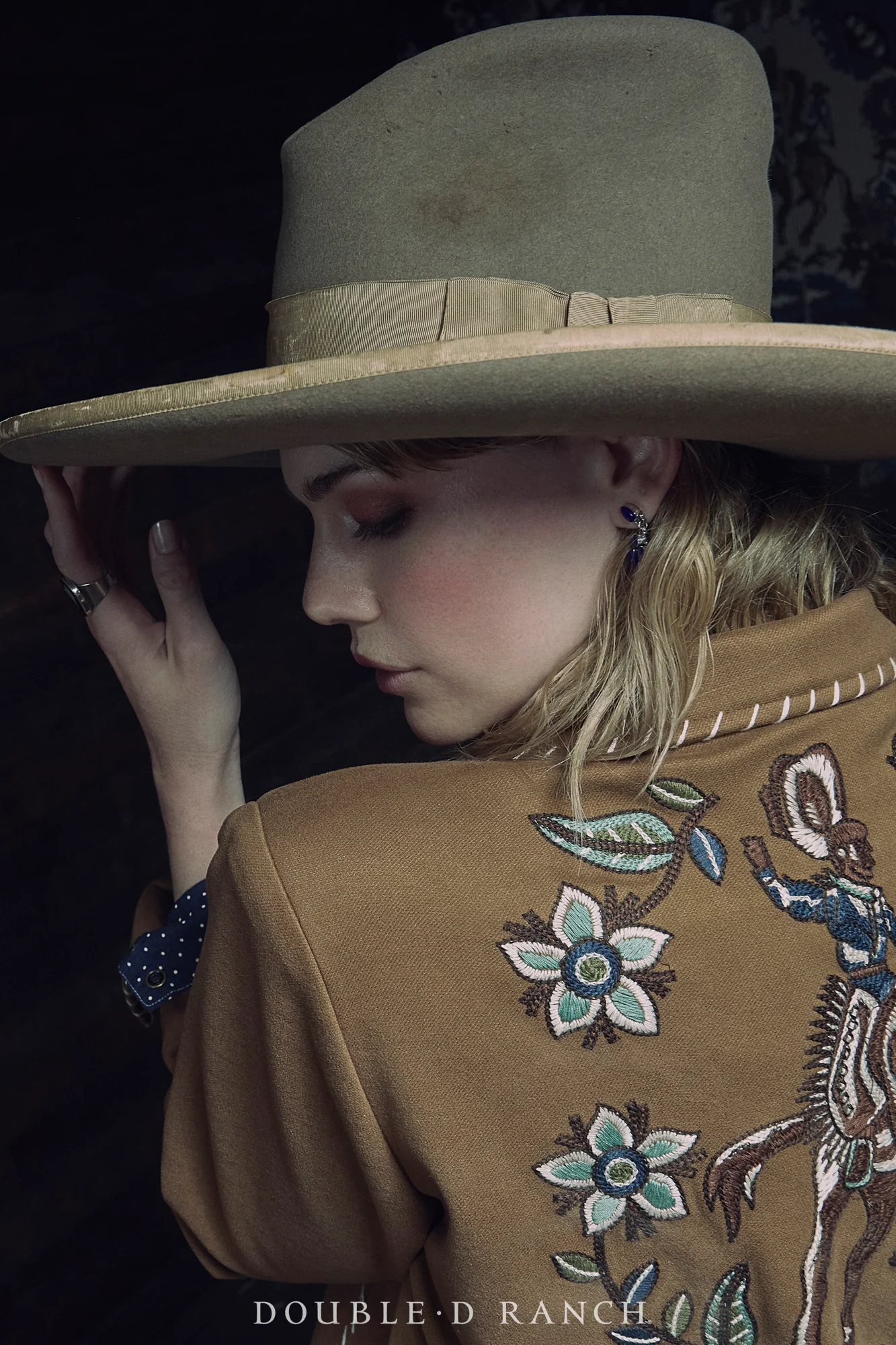 An exquisite alternative to your leather biker, this beauty has all the aesthetic and embellishments you expect from Double D Ranch, but brought to life on a luxe blended fabric that’s perfect for transitional seasons and an easy outfit upgrade. The warm caramel ‘elk horn’ brown is complemented by lovely light blue floral embroidery and a bucking bronc ridin’ cowboy on the back. It’s finished with contrast whipstitching for a little touch of twang!