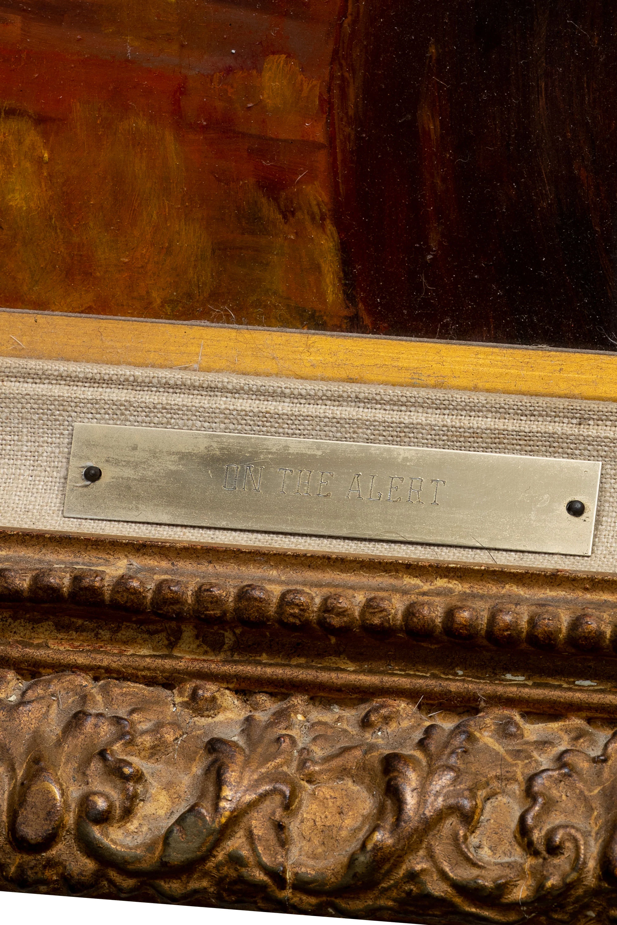 - brass plate on frame: ON THE ALERT