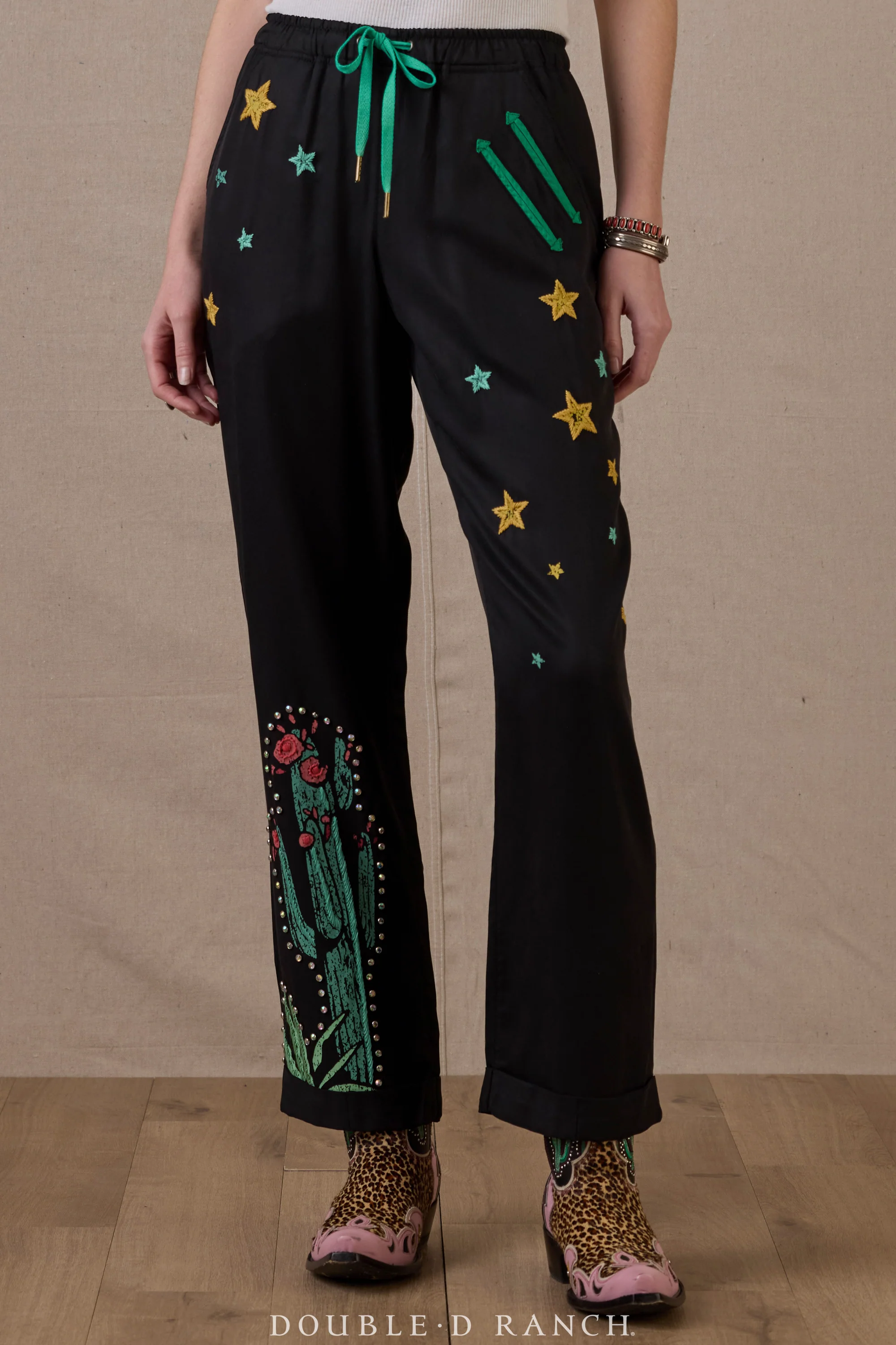 Nudie-inspired style meets a modern silhouette in these cute cropped-and-cuffed joggers! The motif is a retro roadside motel under a starry sky, brought to life on a bold black tencel pant, finished with Western welts and a little bit of bling.