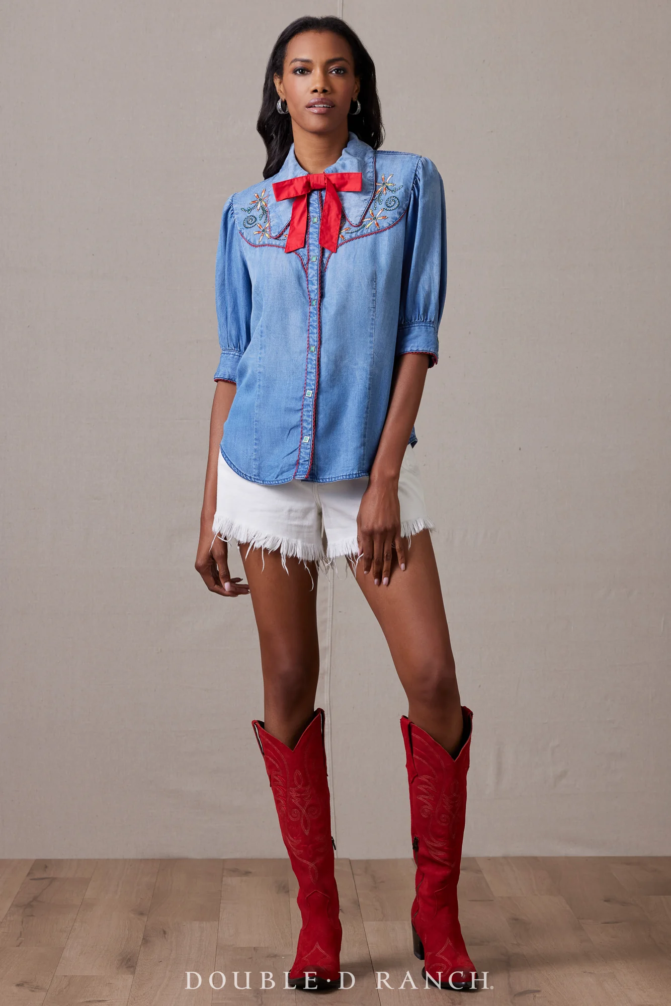 A snazzy spin on a cowgirl classic. The straight-line silhouette gets a feminine flair from the gathered puffy sleeves, ultra-broad collar, and darling front placket of faux turquoise pearl snaps. The yoke is embellished with embroidery and beadwork for a touch of glam, and it’s finished with a fun (removable) tie to complement the contrasting red trim.